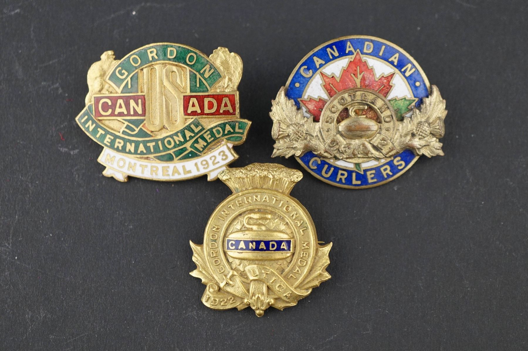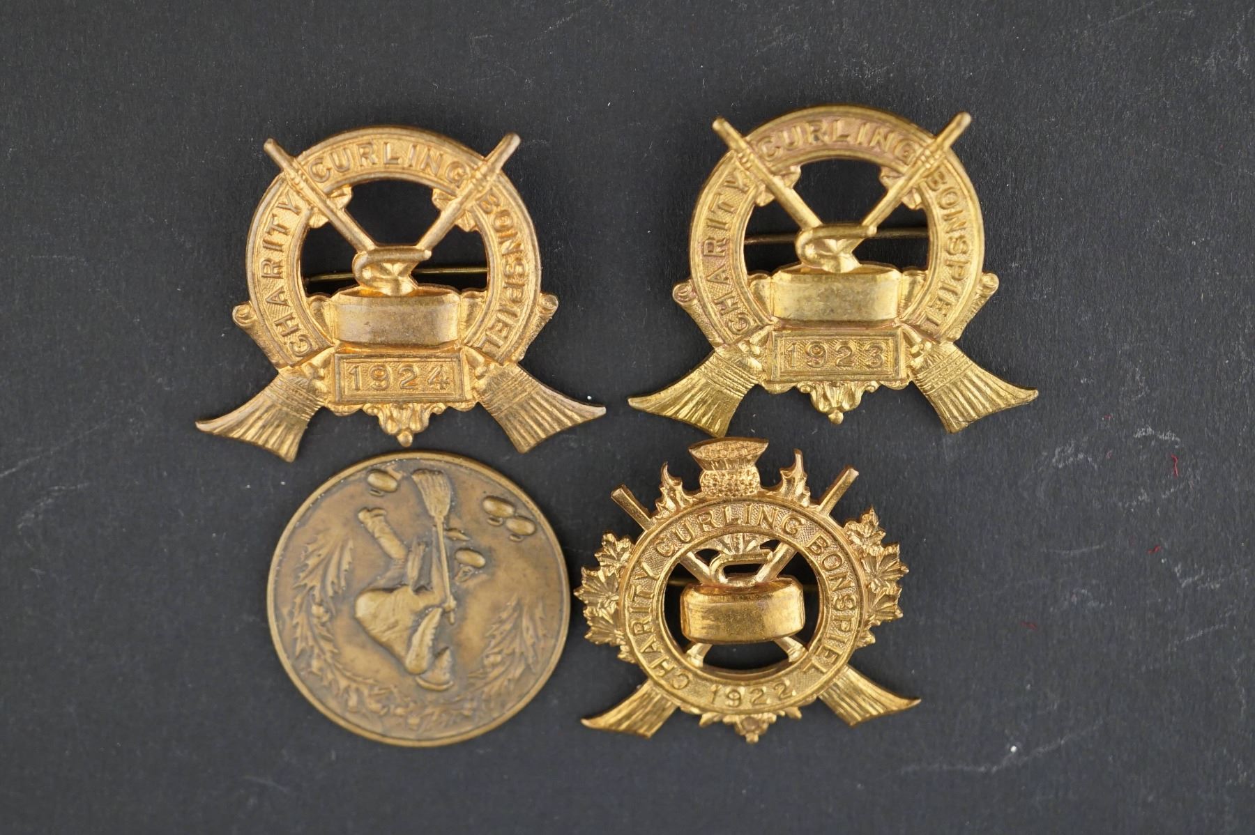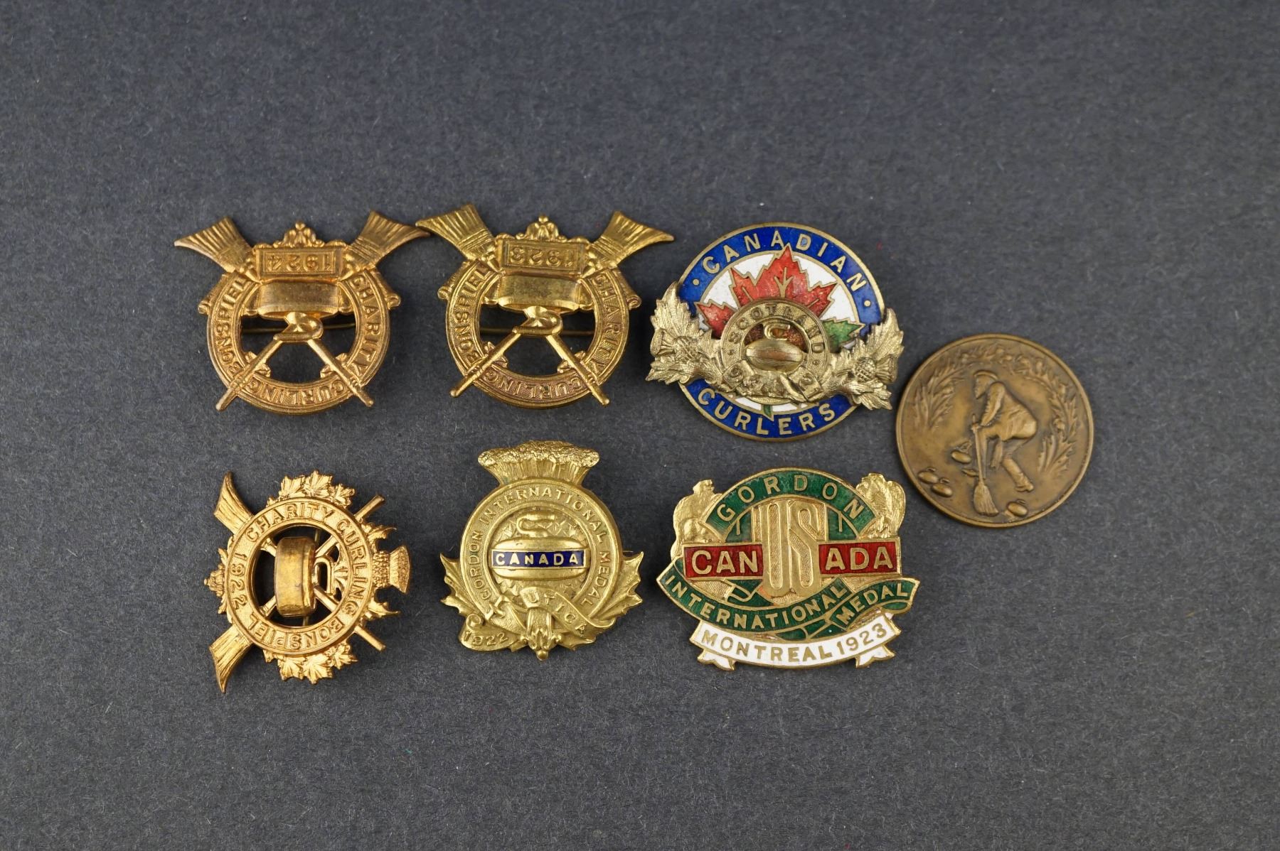 7 Pcs. Curling pins and medal AE-26 Uniface, 3 Charity, 2 Int'l and 1922 Gordon Int'l