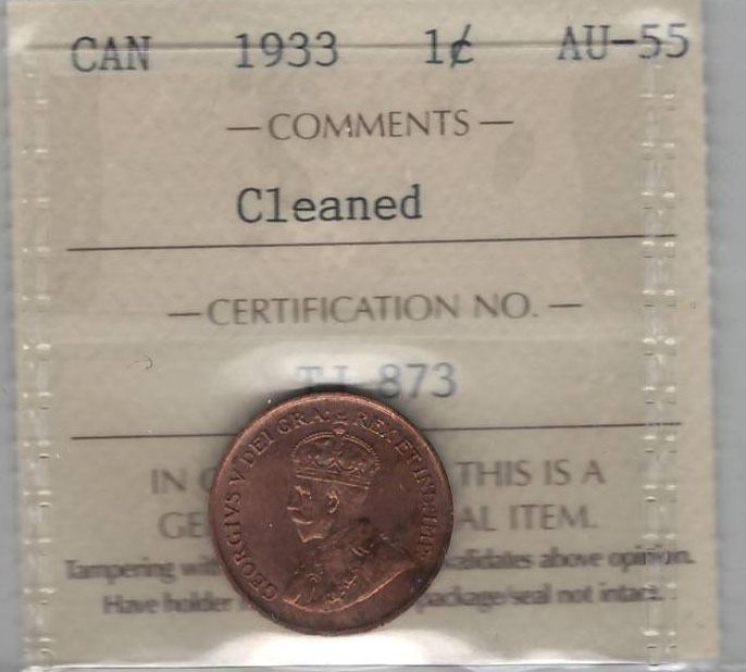 Canada 1933 Small Cent ICCS AU55 Cleaned