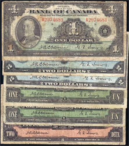 1935 One Dollar BC-1 and Two Dollars BC-3, two notes. Plus 1937 One Dollar Osborne-Towers, BC-21a two notes and 1937 Two Dollars Osborne-Towers, BC-22a. Total six notes, G or better, mostly VG or better, one of the BC-3s with faded back