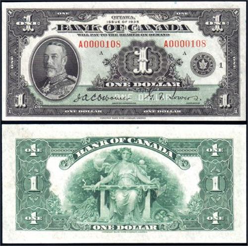1935 One Dollar, BC-1 Serial Number A0000108 A, CCGS UNC63, hinge remnant on back. A search reveals a 2mm by 4mm triangular remnant of a mounting hinge somewhat hidden on the back