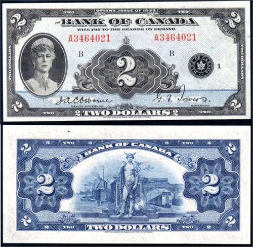 1935 Two Dollars, BC-3 Serial Number A3464021 B, CCGS UNC63. A very bright note, slightly off-centre toward the bottom and the left
