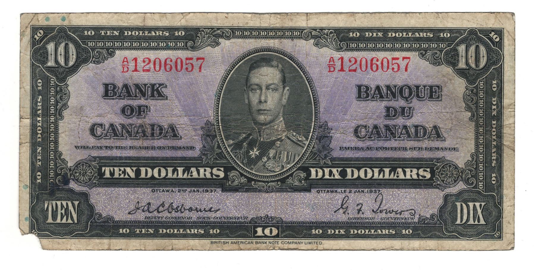 Canada 1937 $10 Banknote Osborne-Towers F corner missing