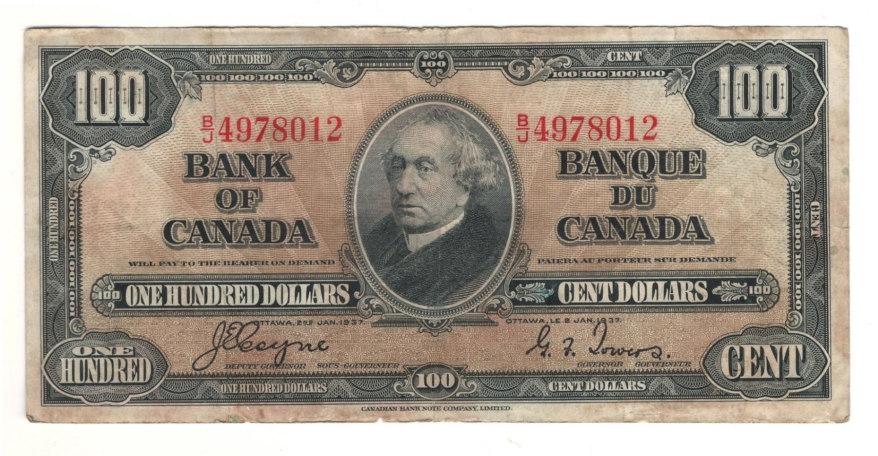 Canada 1937 $100 Banknote Coyne-Towers B/J BC-27c F stains