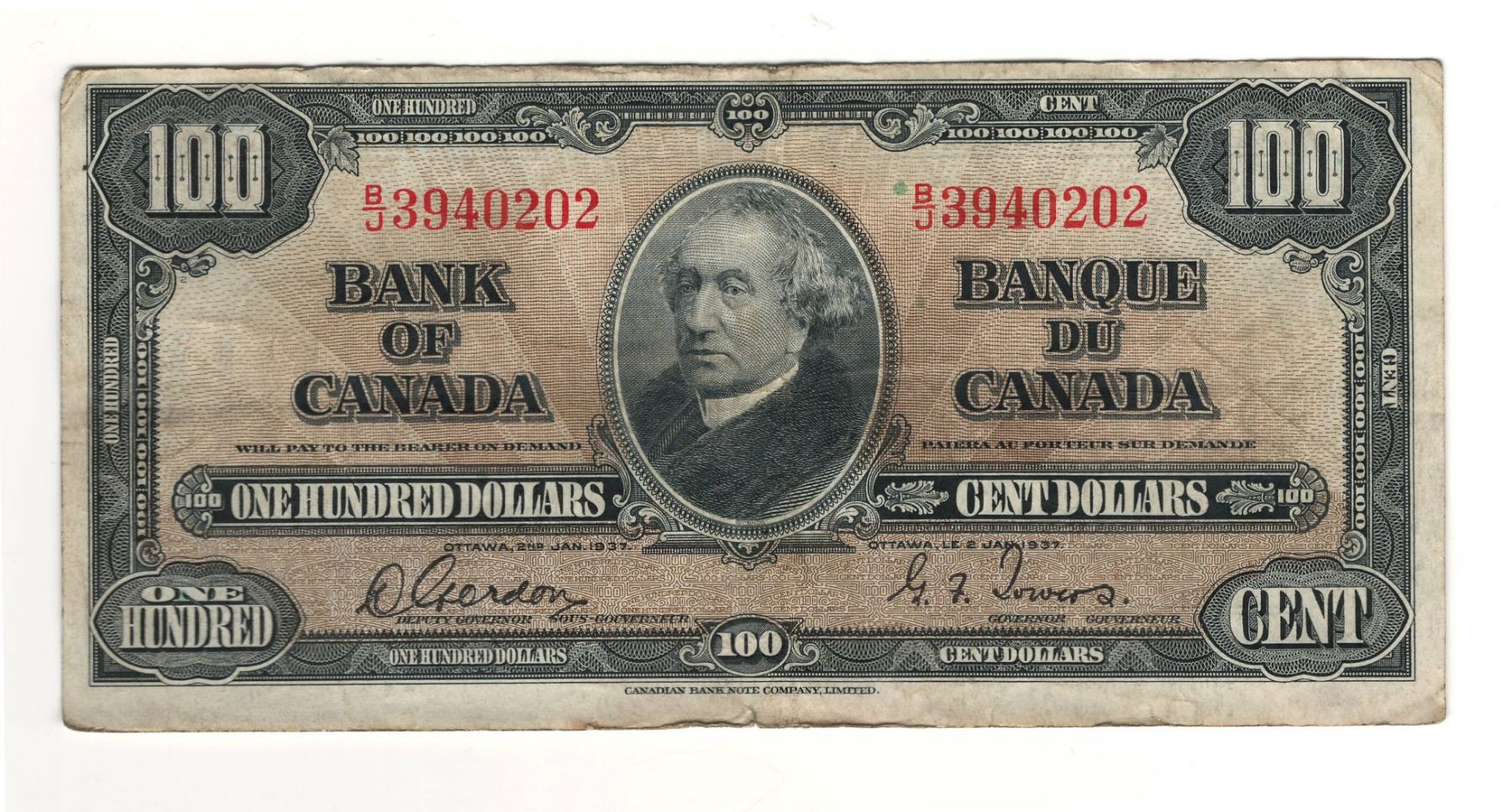 Canada 1937 $100 Banknote Gordon-Towers B/J BC-27b F