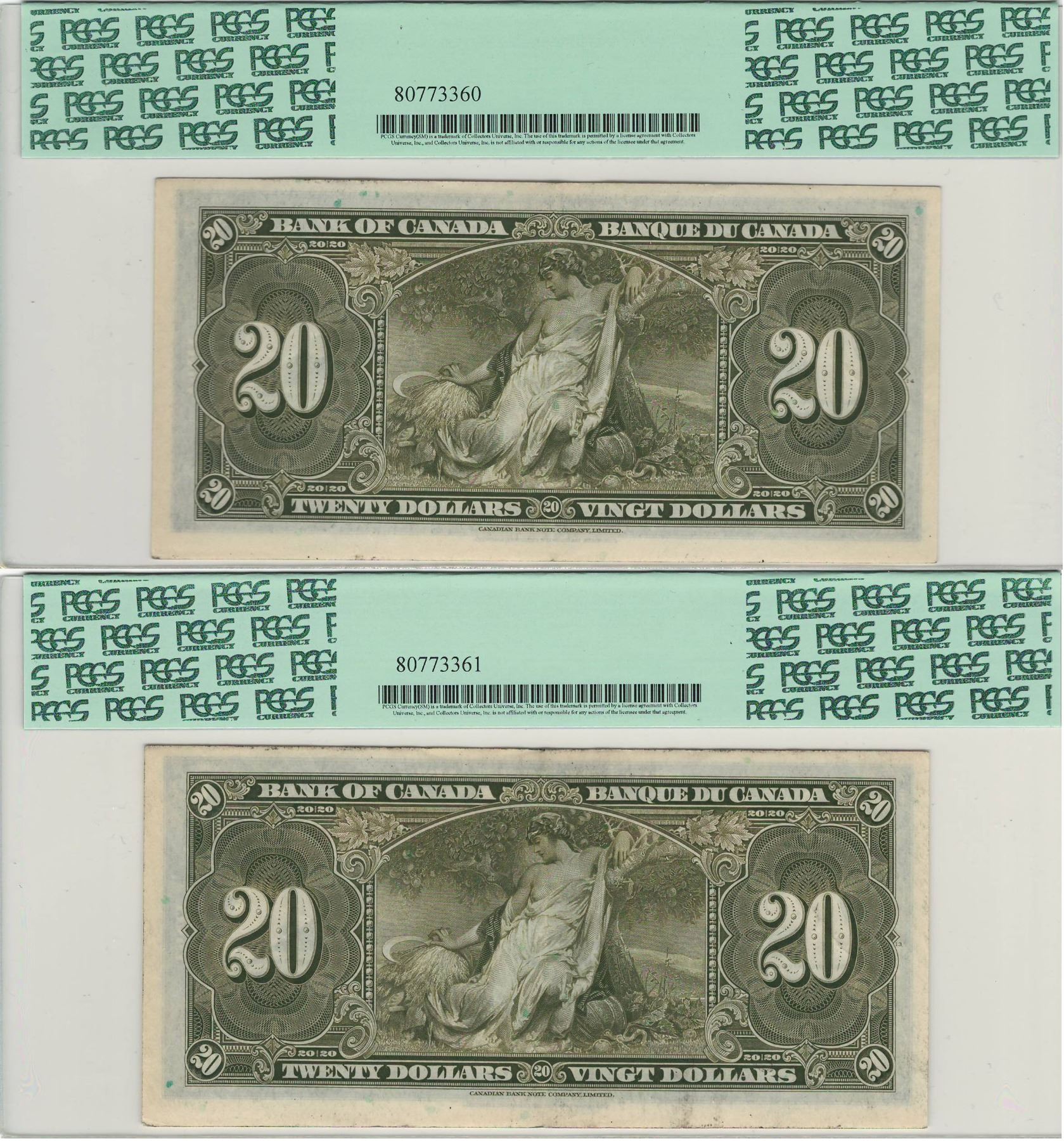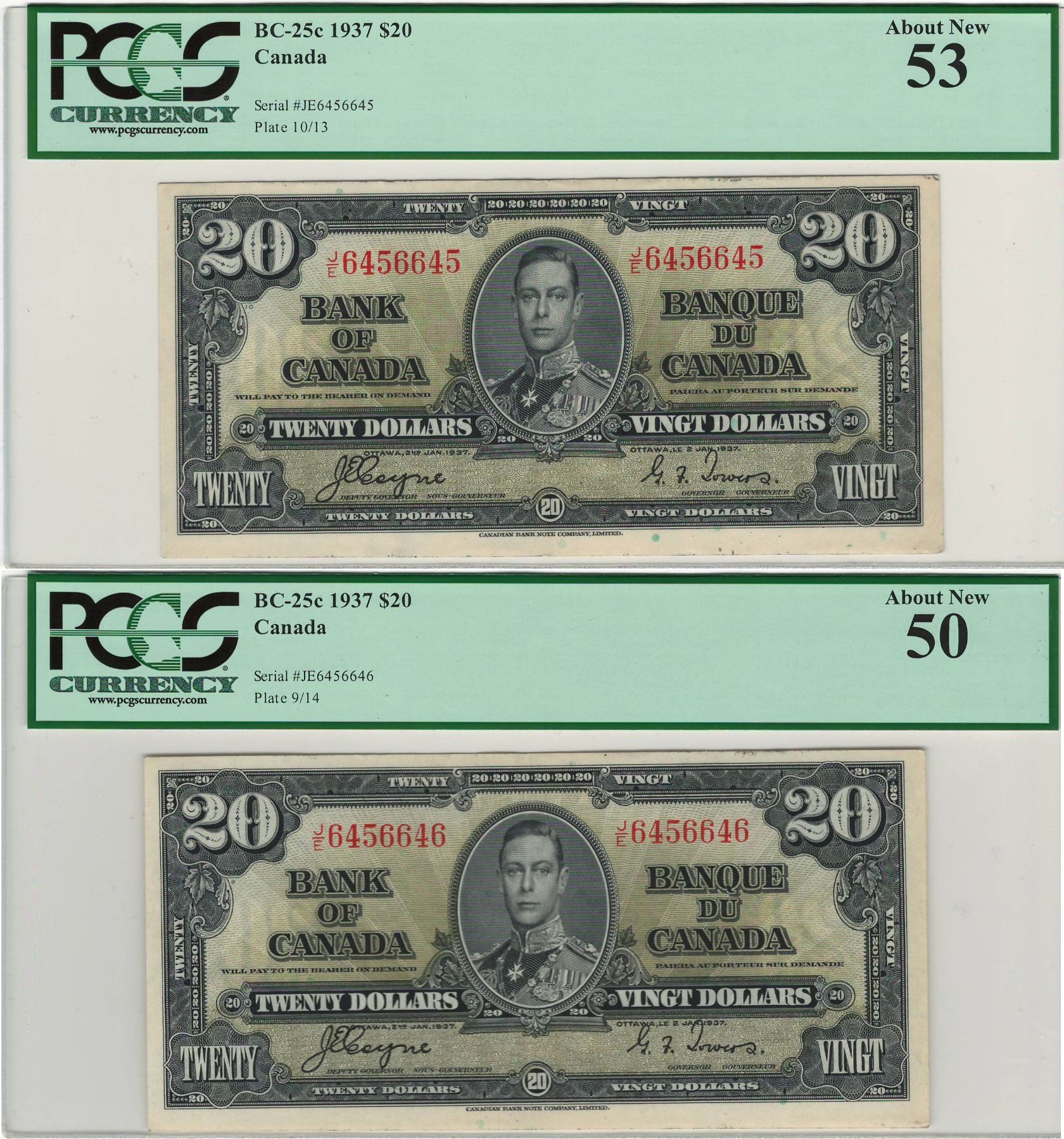Canada 1937 $20 Banknote 2 in Sequence PCGS AU50 & AU53 BC-25c