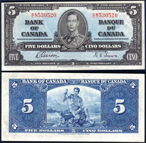 1937 Five Dollars Gordon-Towers BC-23b Serial Number K/C8530520, Certified CCGS UNC62. A bit off-centre toward the top, and slightly bias-cut
