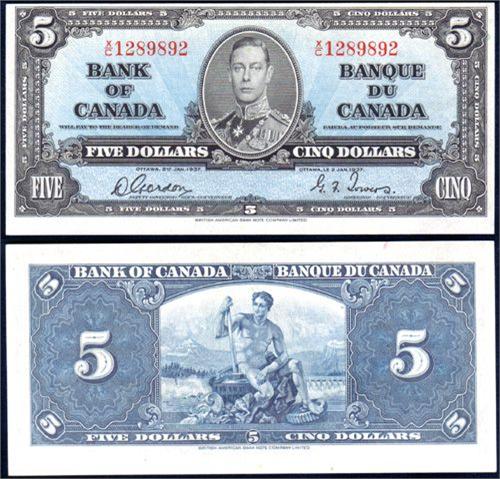 1937 Five Dollars Gordon-Towers, BC-23b Serial Number X/C1289892, Uncirculated. A very crisp, bright and clean note, off-centre toward the top