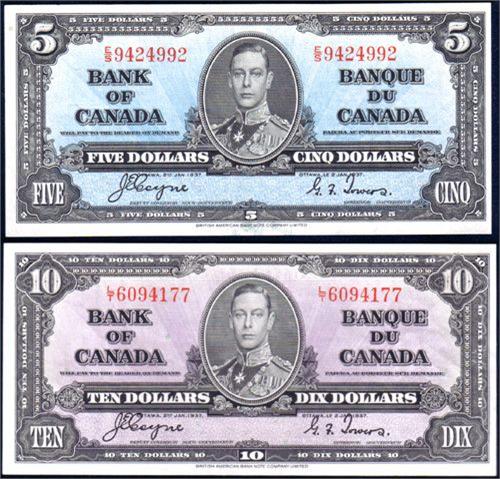 1937 Five Dollars Coyne-Towers, BC-23c Serial Number E/S9424992 and Ten Dollars Coyne-Towers, BC-24c Serial Number L/T6094177, both EF or better
