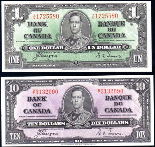 1937 One Dollar Coyne-Towers BC-21d Serial Number Y/M1725580 and Ten Dollars Coyne-Towers BC-24c Serial Number D/T3132090, both AU-Uncirculated