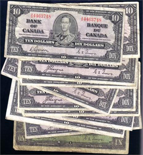 1937 Ten Dollars Gordon-Towers, BC-24b. Plus nine notes Coyne-Towers, BC-24c and One Dollar Gordon-Towers, BC-21c. Total eleven notes VG to VF, mostly Fine and better, some with problems