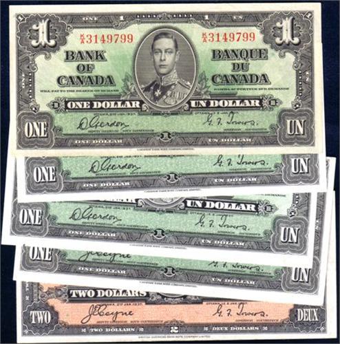 1937 One Dollar Gordon-Towers, BC-21c three notes and Coyne-Towers, BC-21d. Plus Two Dollars Coyne-Towers, BC-22c. Total five notes, EF or better