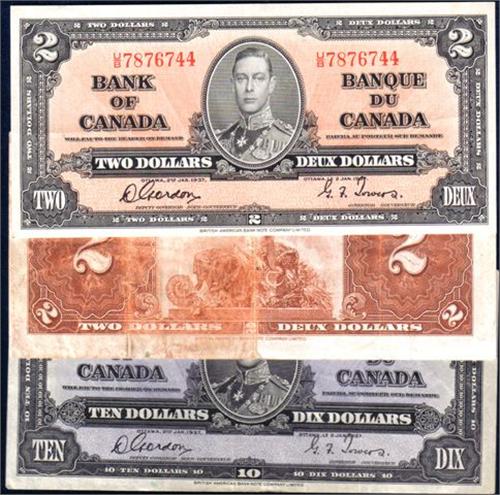 1937 Two Dollars Gordon-Towers, BC-22b EF. Plus Coyne-Towers, BC-22c VF with fading and staining on the back. Plus Ten Dollars Gordon-Towers, BC-24b VF