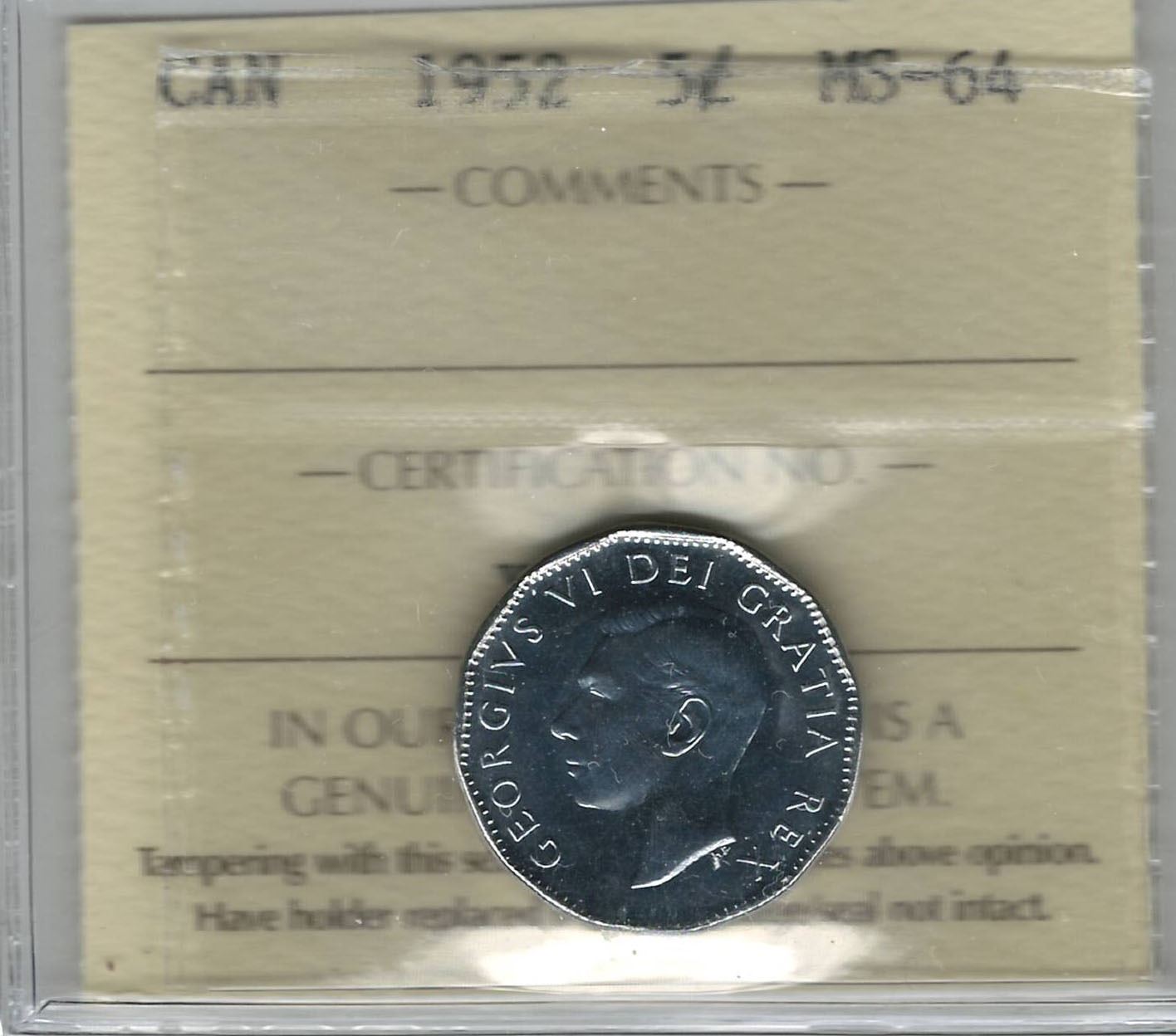 Canada 1952 Nickel 5 Cent ICCS MS64