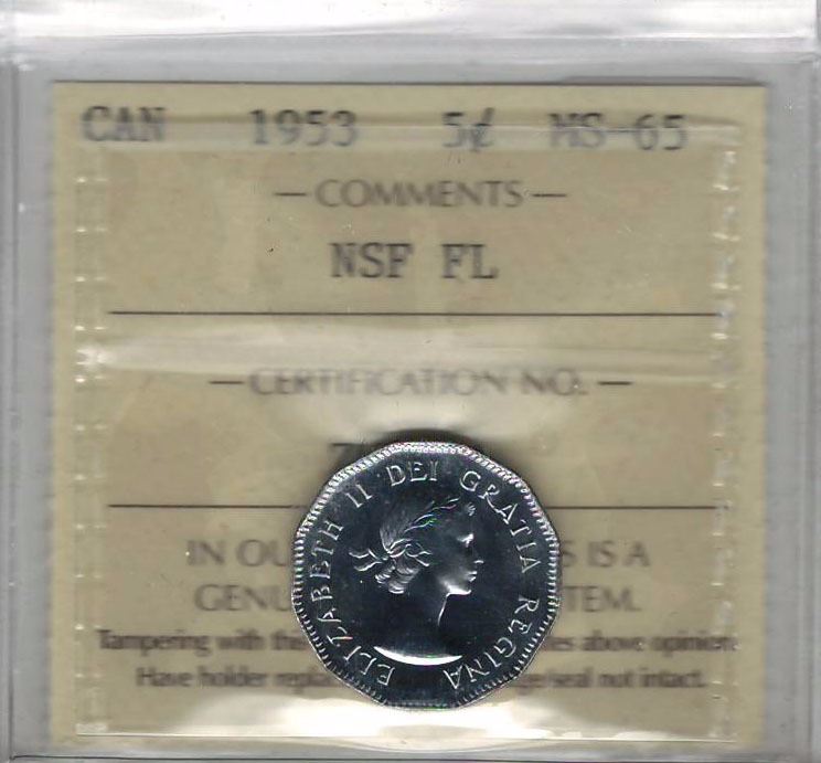 Canada 1953 NSF FL Nickel 5 Cent ICCS MS65