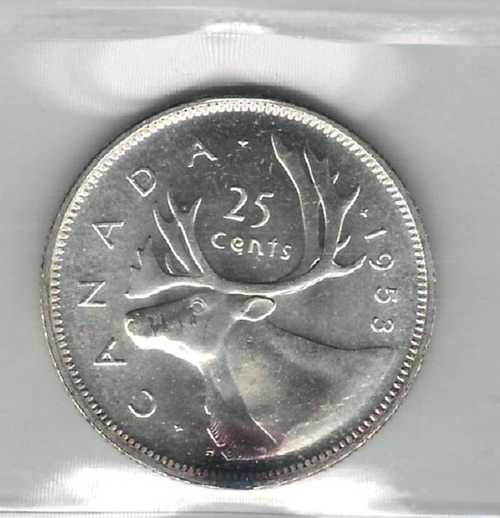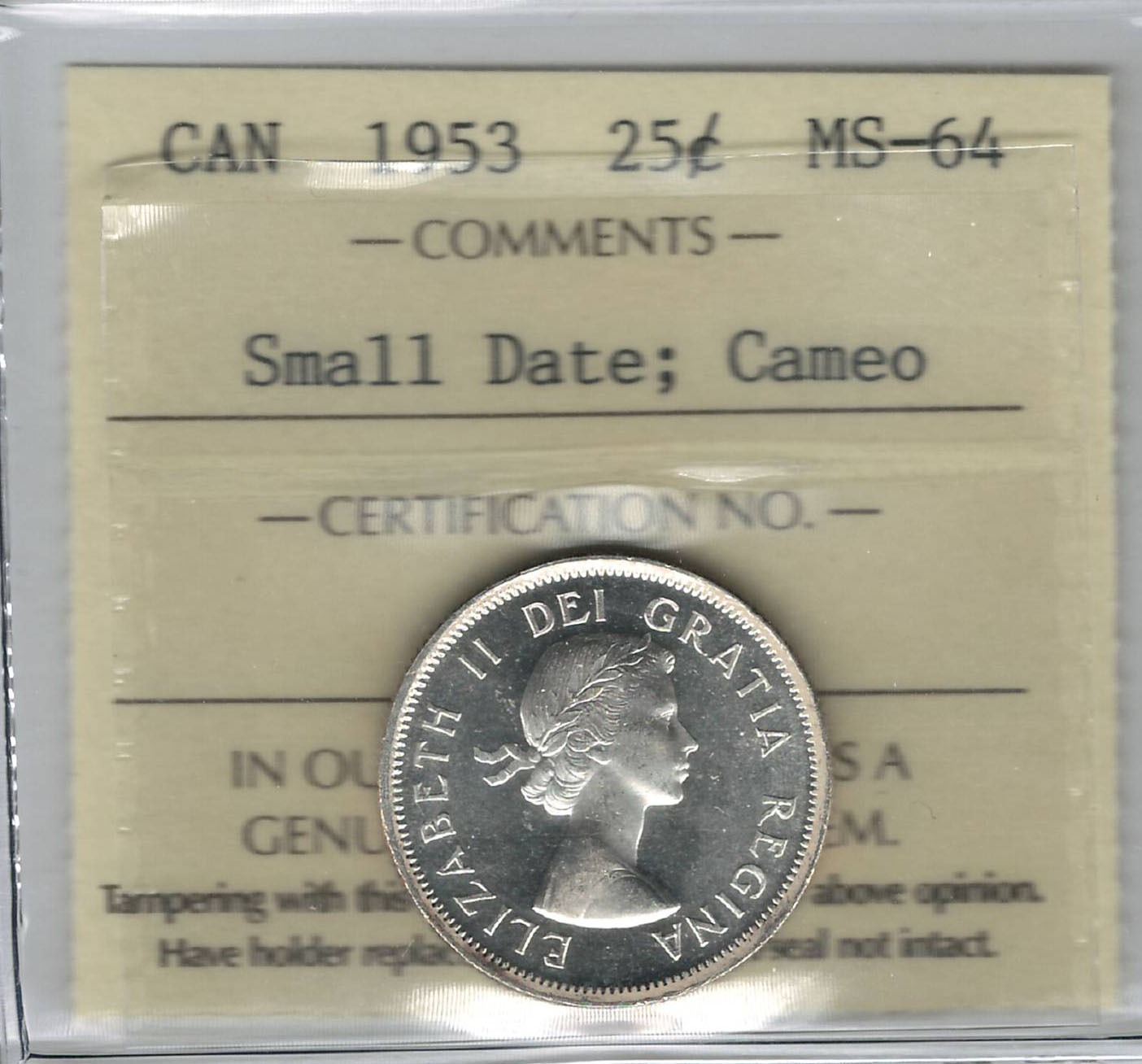 Canada 1953 Silver 25 Cent Small Date SF ICCS MS64 Cameo