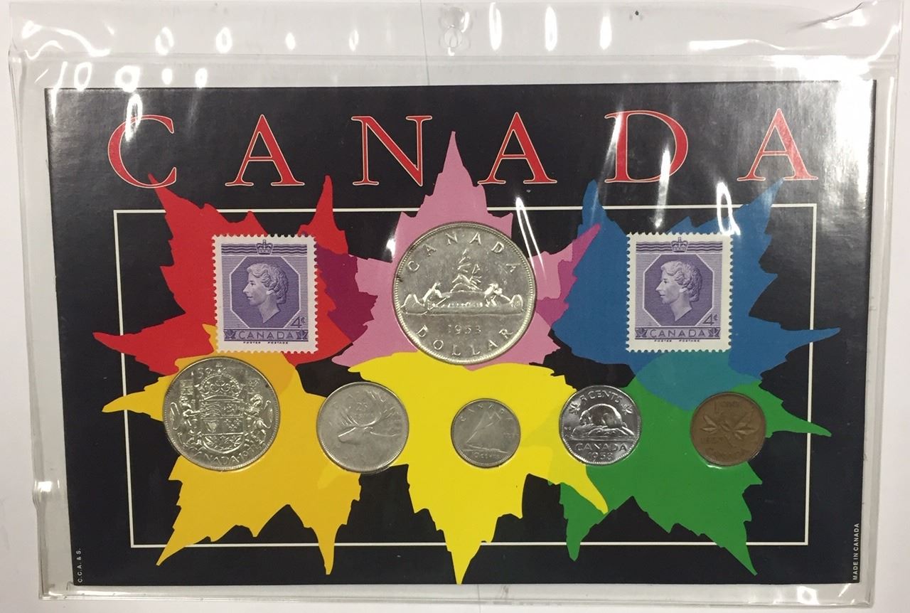 Canada 1953 Year Set in Maple Leaf Themed Holder. Includes 2 stamps.