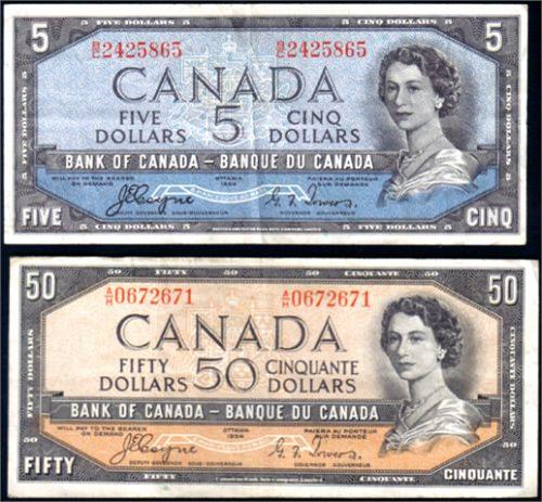 1954 Devil's Face Five Dollars Coyne-Towers, BC-31a Serial Number B/C2425865 and Fifty Dollars Coyne-Towers, BC-34a Serial Number A/H0672671, both VF