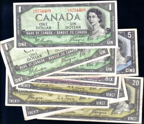 1954 Devil's Face One Dollar Beattie-Coyne, BC-29b three notes, Five Dollars Coyne-Towers, BC-31a, Ten Dollars Coyne-Towers, BC-32a and Beattie-Coyne, BC-32b and Twenty Dollars Coyne-Towers, BC-33a three notes and BC-33b. Total ten notes, Fine and better