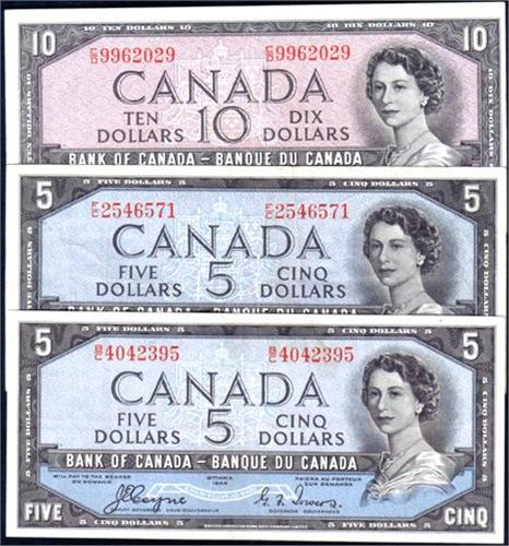 1954 Devil's Face Five Dollars Coyne-Towers, BC-31a and Beattie-Coyne, BC-31b. Plus Ten Dollars Coyne-Towers, BC-32a. Total three notes, all VF or better