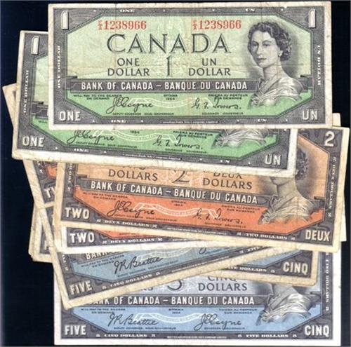 1954 Devil's Face One Dollar Coyne-Towers, BC-29a two notes and Beattie-Coyne, BC-29b. Plus Two Dollars Coyne-Towers, BC-30a two notes and Beattie-Coyne, BC-30b two notes. Plus Five Dollars Beattie-Coyne, BC-31b five notes. Total twelve notes, VG and better