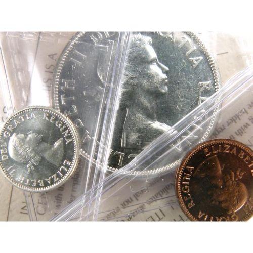 1954 Proof-Like Set. The One Cent is ICCS PL-64 Red, the Five Cents and Fifty Cents are ICCS PL-63, the Ten Cents is ICCS PL-65 Cameo, the Twenty-Five Cents is ICCS PL-64 and the Dollar is ICCS PL-60