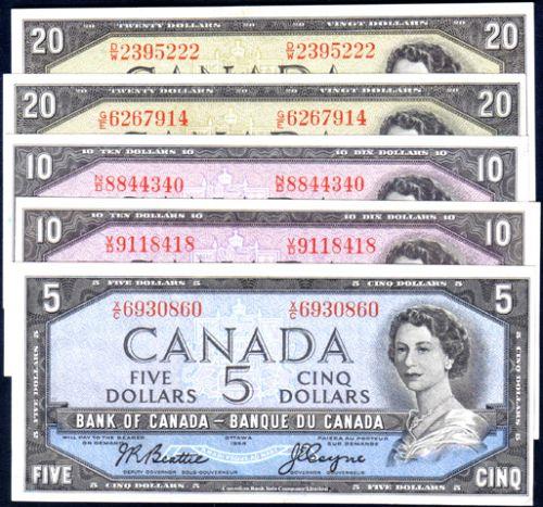 1954 Five Dollars Beattie-Coyne, BC-39a, Ten Dollars Beattie-Coyne, BC-39a two notes and Twenty Dollars Beattie-Coyne, BC-41a two notes. A total of five notes, EF and AU