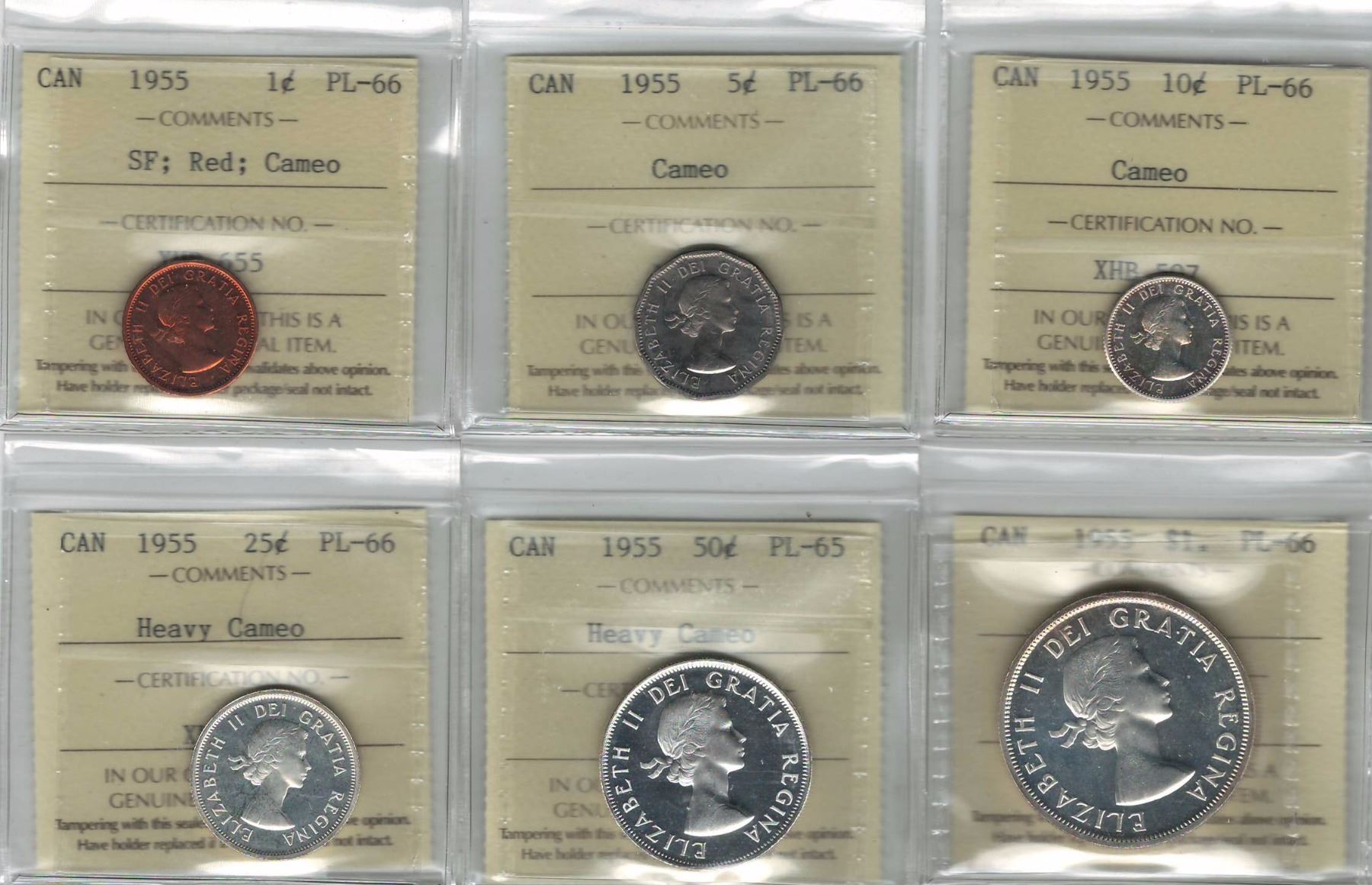 Canada 1955 Proof Like Set. 1c PL66 Cameo, 5c PL66 Cameo, 10c PL66 Cameo, 25c PL66 Heavy Cameo, 50c PL65 Heavy Cameo, $1.00 PL66 Cameo