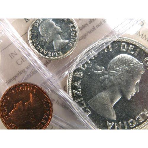 1955 Proof-Like Set. The Cent is ICCS PL-66 Red Cameo, the Five Cents is ICCS PL-65, the Fifty Cents is ICCS PL-65, the TenCents is ICCS PL-64 Heavy Cameo, the Twenty-Five Cents is ICCS PL-66 and the Dollar is ICCS PL-64 Heavy Cameo