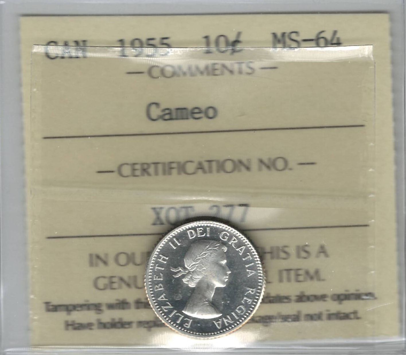 Canada 1955 Silver 10 Cent ICCS MS64 Cameo