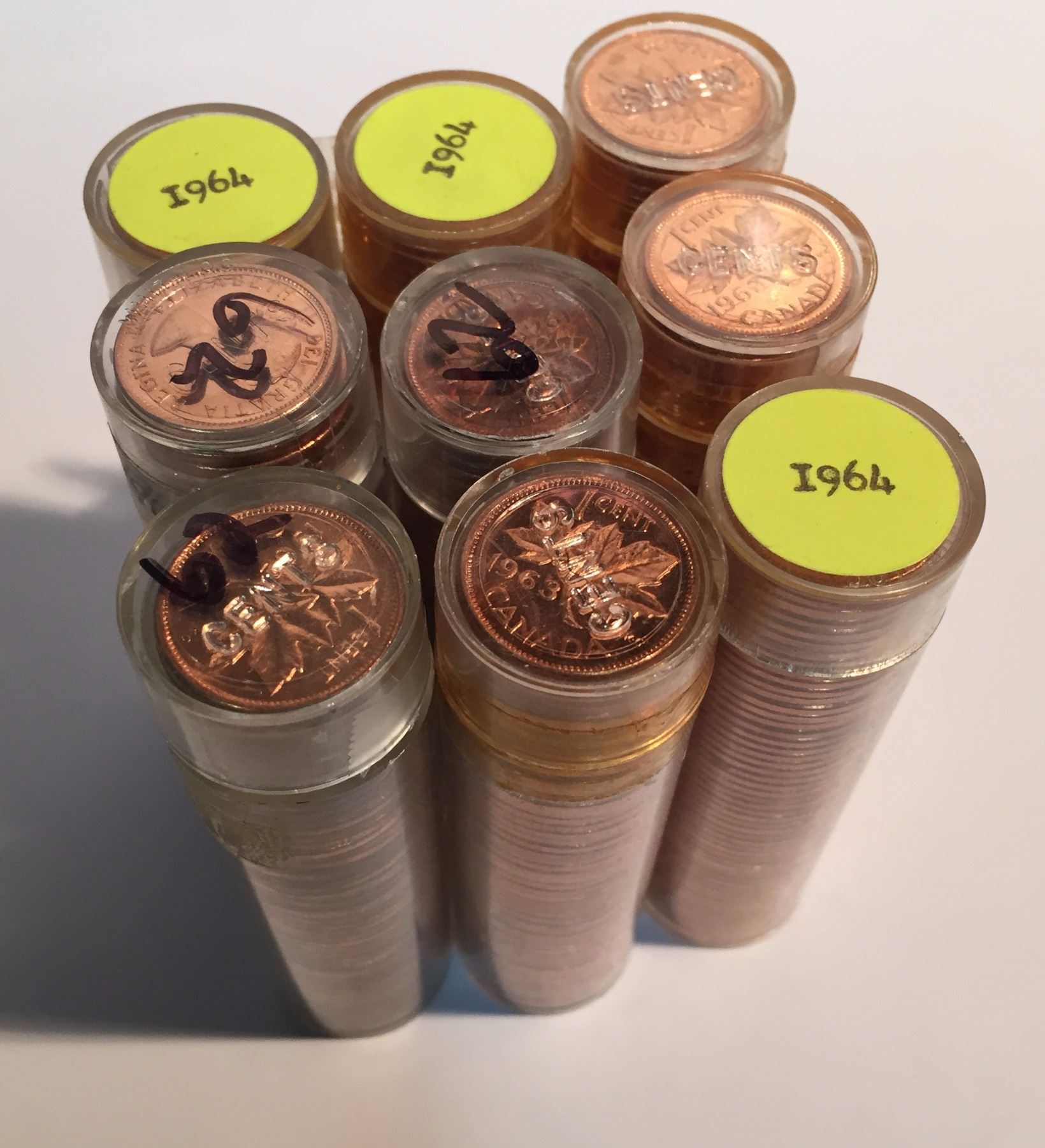 Canada 1962, 1963, 1964, 1 Cent BU Rolls. 3 of each date.