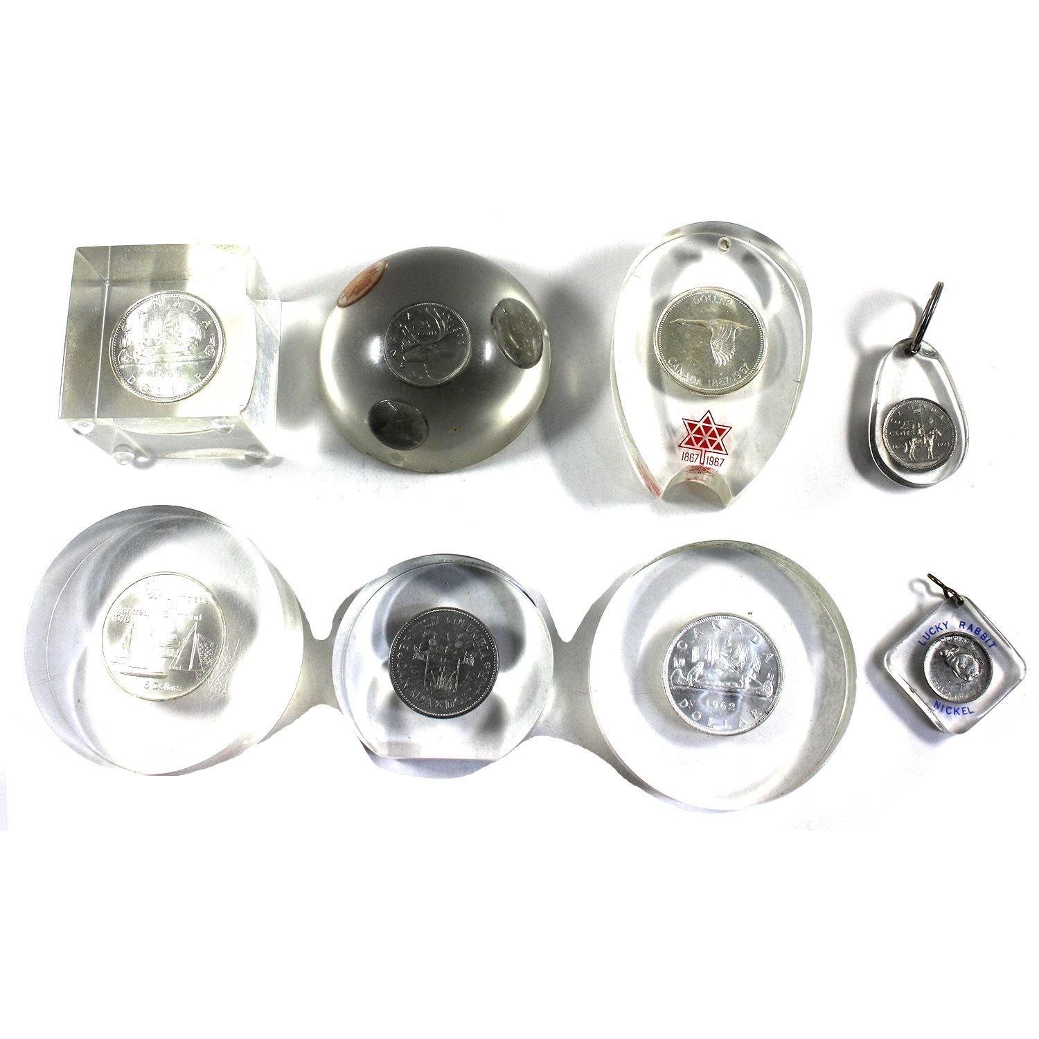 Canada 1962-1973 Assorted Coins in Acrylic Display. INCLUDES: 1962 $1 Paperweight, 1965 $1 Paperweight, 1967 5-cent "Lucky Rabbit" Keychain (missing key ring), 1967 $1 Paperweight, 1970 4-piece Set (1c, 5c, 10c, & 25c) in Paperweight , 1971 $1 British Colombia in Paperweight, 1973 25-cent RCMP in Keychain, & 1973 Montreal Olympics Kingston and Sailboats Paperweight. Some hairline cracking or small chips. 8pcs.