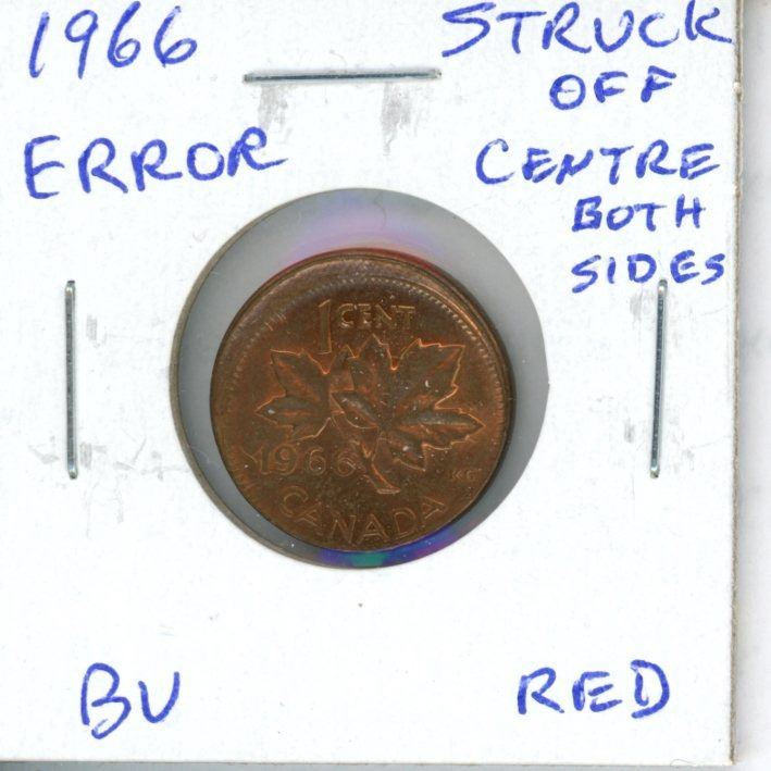 Canada 1966 Cent Error. Struck off centre on both sides. BU Red.