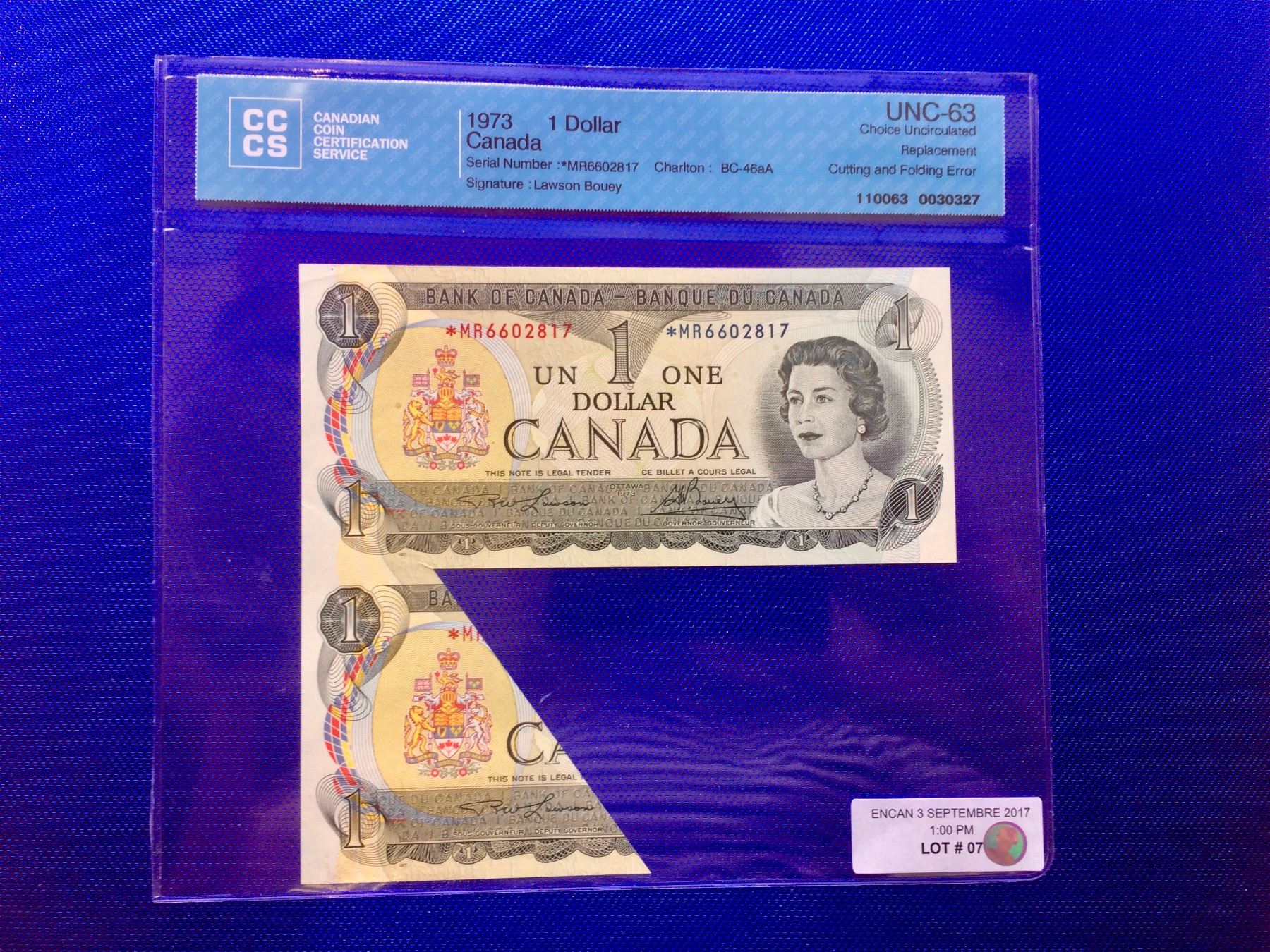 Canada 1973 1 DOLLAR REPLACEMENT NOTE WITH CUTTING AND FOLDING ERROR