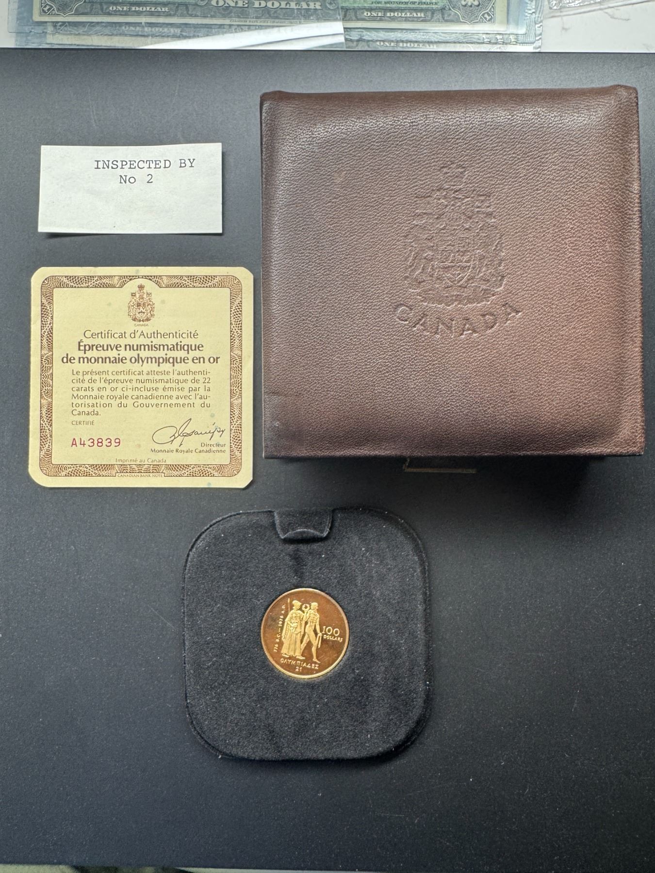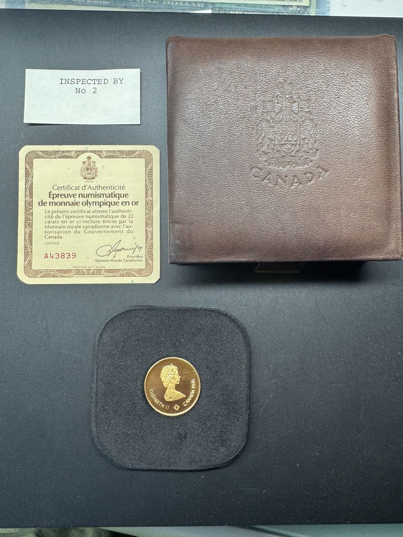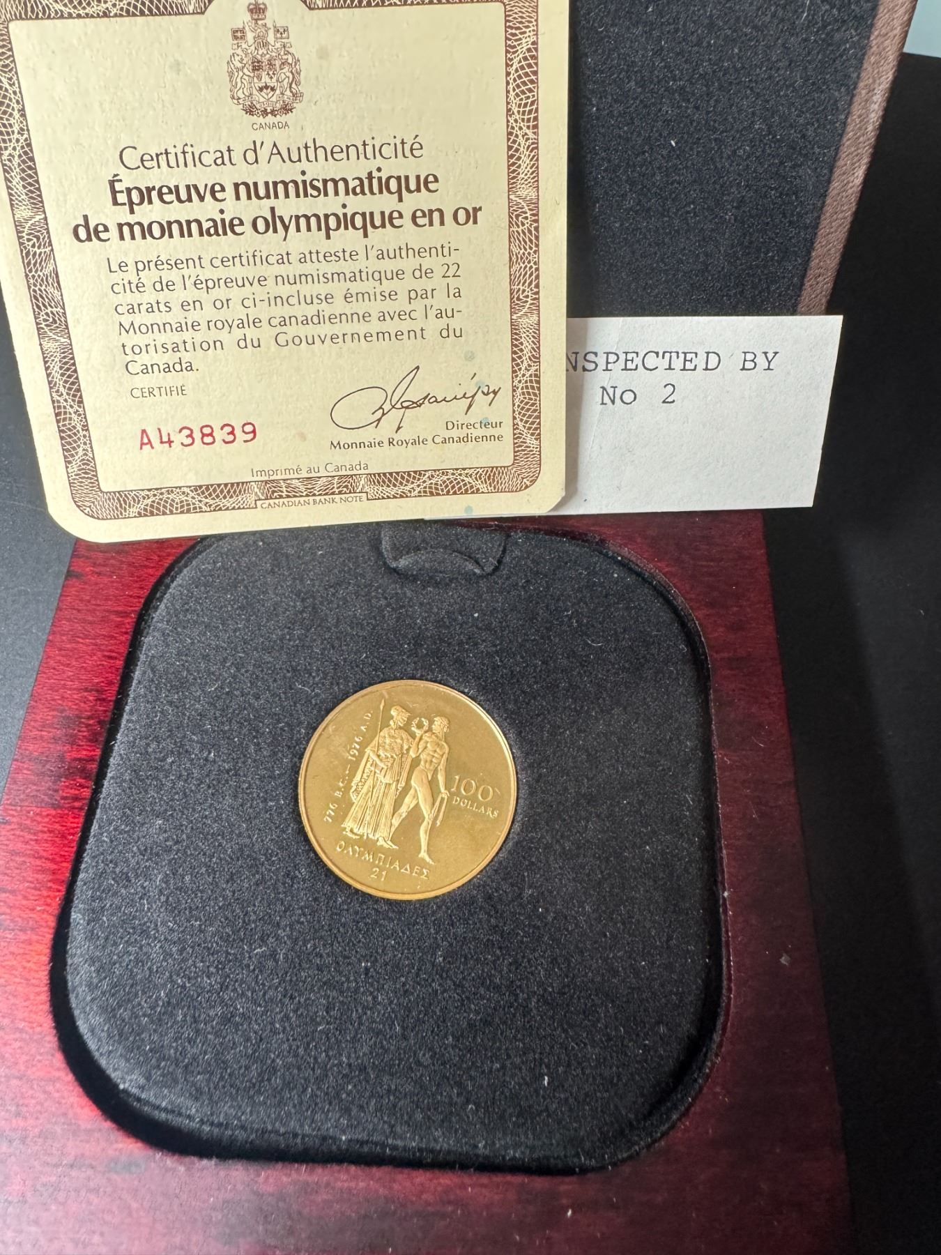加拿大, 1979, 蒙特婁第21屆奧運紀念金幣 100元。渥太華鑄幣廠。伊莉莎白二世頭像。附原廠 盒子及發行證書,編號A43839。總金重: 0.5盎司。