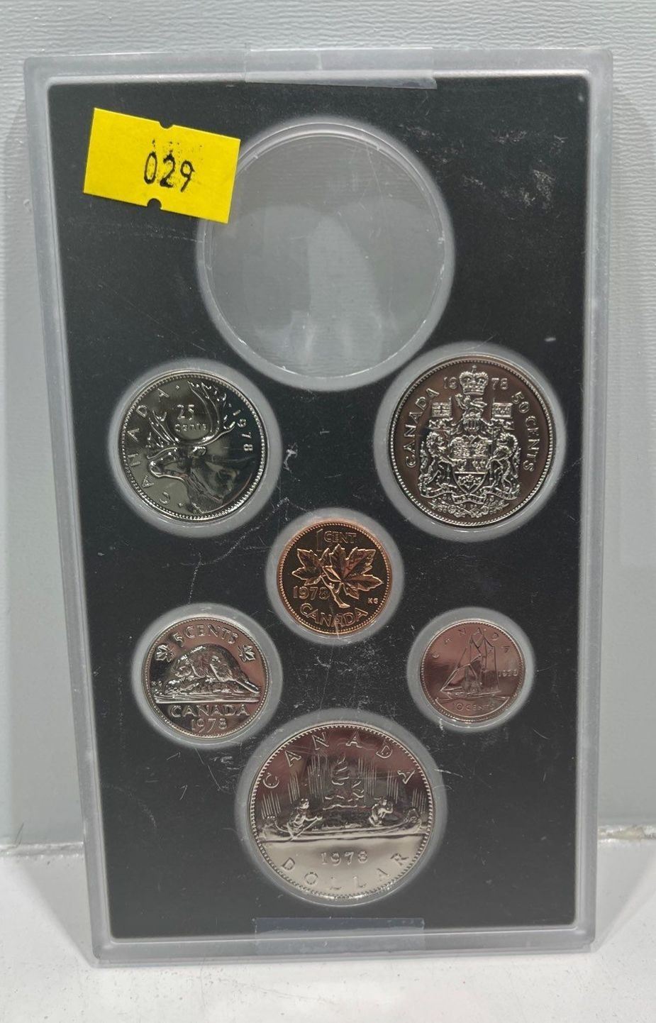 1978 Canada 6-coin Frosted Proof Set broken from the official Proof Double Dollar set issued by the RCM. You will receive the coins in the hard snap-lock case without the commemorative silver dollar (has been removed)