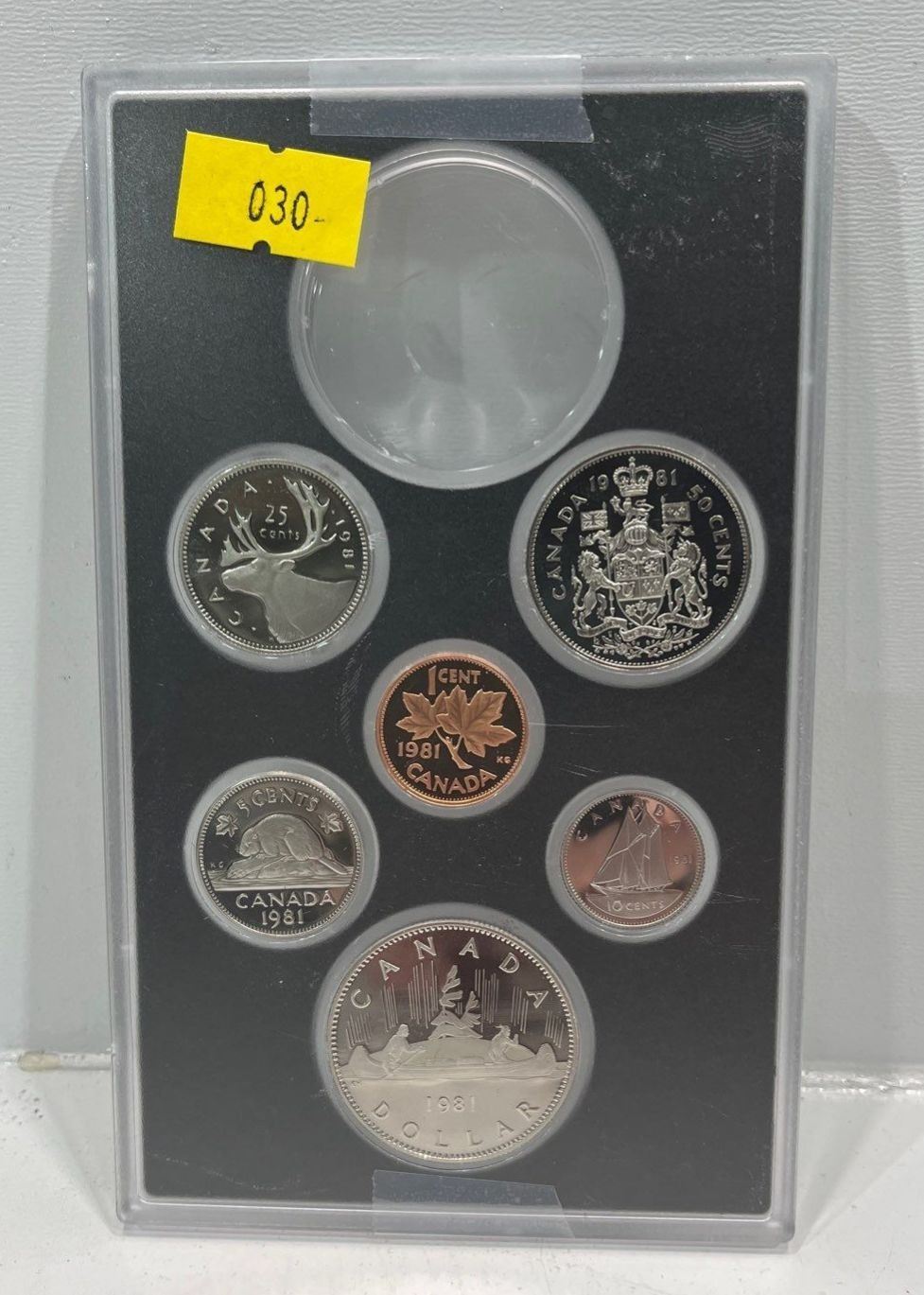 1981 Canada 6-coin Frosted Proof Set broken from the official Proof Double Dollar set issued by the RCM. You will receive the coins in the hard snap-lock case without the commemorative silver dollar (has been removed)