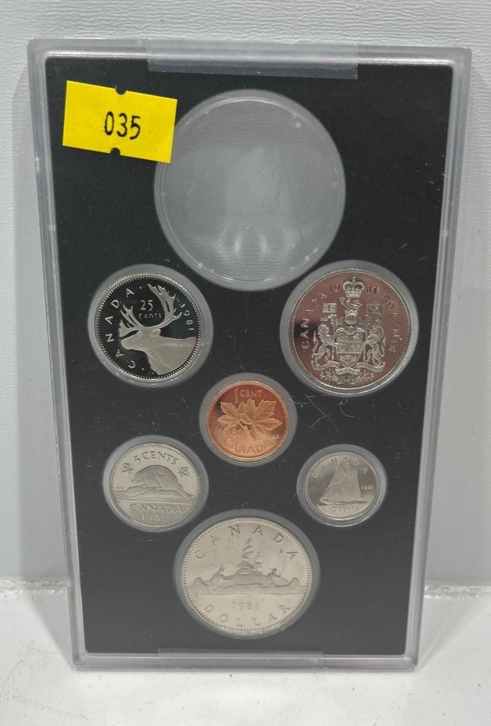 1981 Canada 6-coin Frosted Proof Set broken from the official Proof Double Dollar set issued by the RCM. You will receive the coins in the hard snap-lock case without the commemorative silver dollar (has been removed)