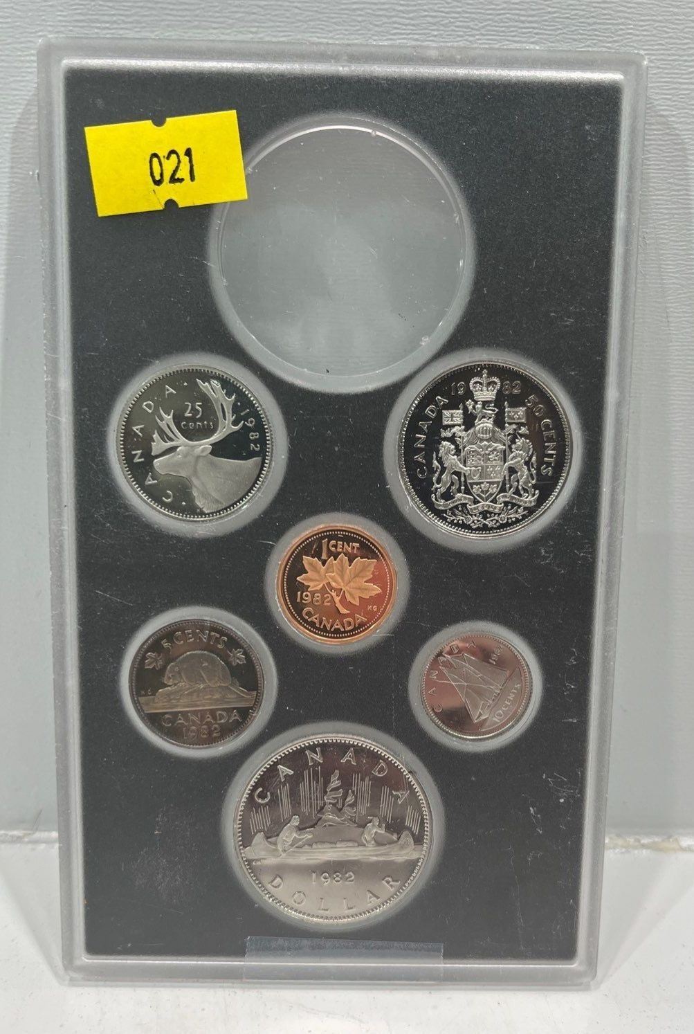 1982 Canada 6-coin Frosted Proof Set broken from the official Proof Double Dollar set issued by the RCM. You will receive the coins in the hard snap-lock case without the commemorative silver dollar (has been removed)