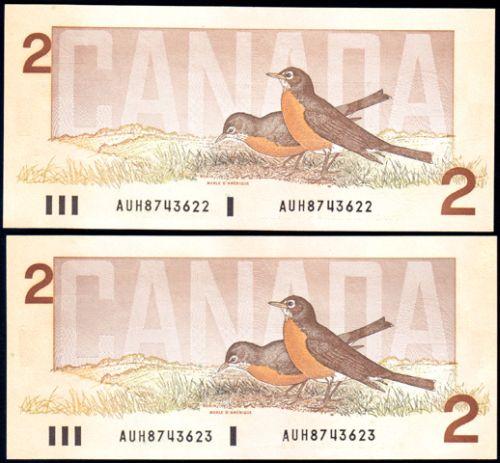1986 Two Dollars Crow-Bouey, BC-55a. Two Consecutive Serial Numbers AUH8743622 and AUH8743623, both Uncirculated