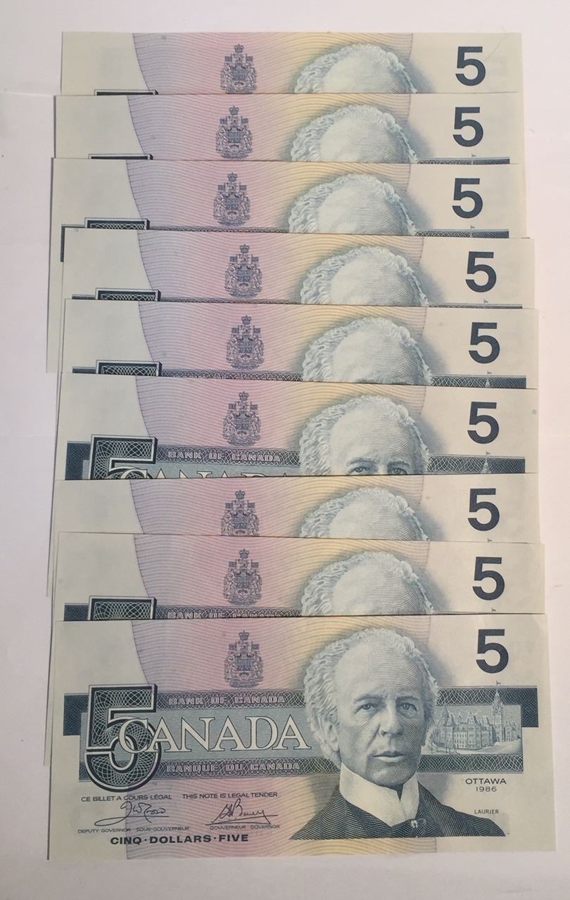 Canada 1986 $5 Banknote (9 in Sequence) EF-AU BC-56a