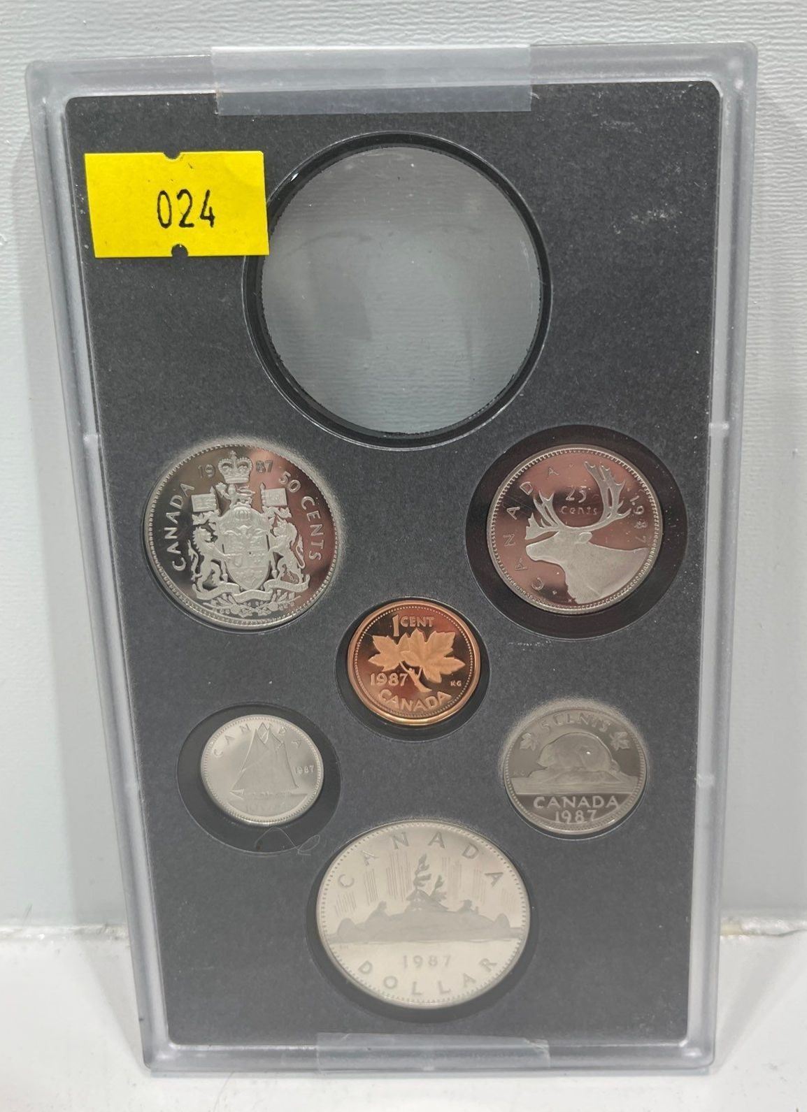 1987 Canada 6-coin Frosted Proof Set broken from the official Proof Double Dollar set issued by the RCM. You will receive the coins in the hard snap-lock case without the commemorative silver dollar (has been removed)