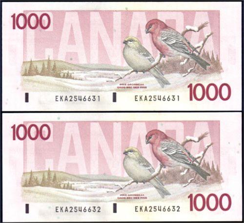 1988 One Thousand Dollars 1988 Bonin-Thiessen, BC61b Two Consecutive Serial Numbers EKA2546631 CCGS UNC63 and EKA2546632 CCGS UNC 64