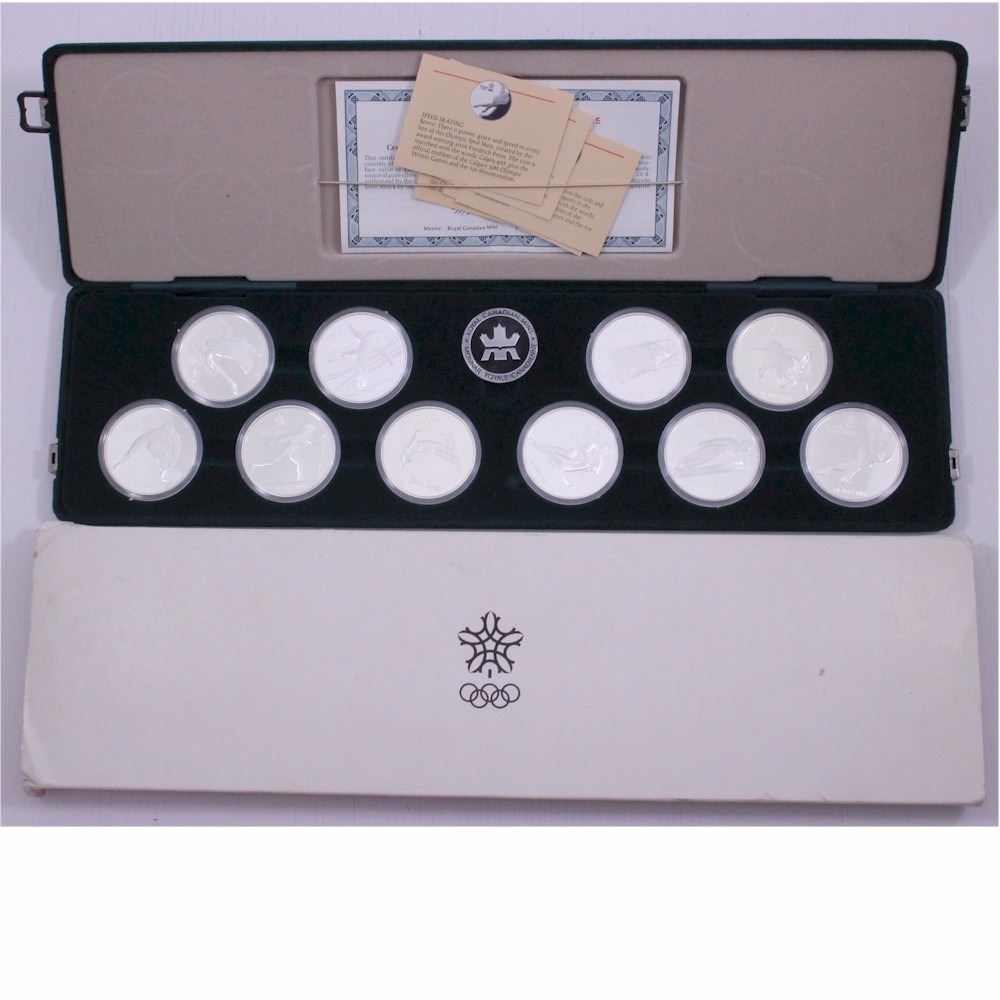 This Olympic Coin Set consists of 10 Sterling Silver coins, each having a face value of $20 and each containing One Troy Ounce of Pure Silver. This set also comes in the original green velvet display case with the official RCM Medallion and five certificates.