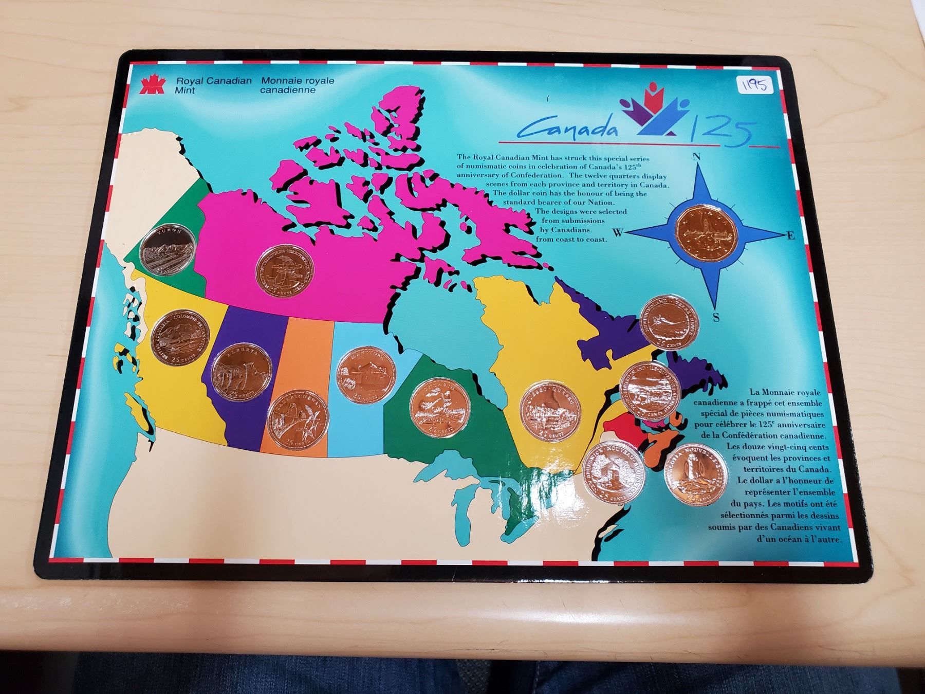 Canada 1992 125th Anniversary of Confederation set of 13. Includes 12 25 cents, one for each province & territory, and one Parliament Loonie. Housed in its original Royal Canadian Mint holder.