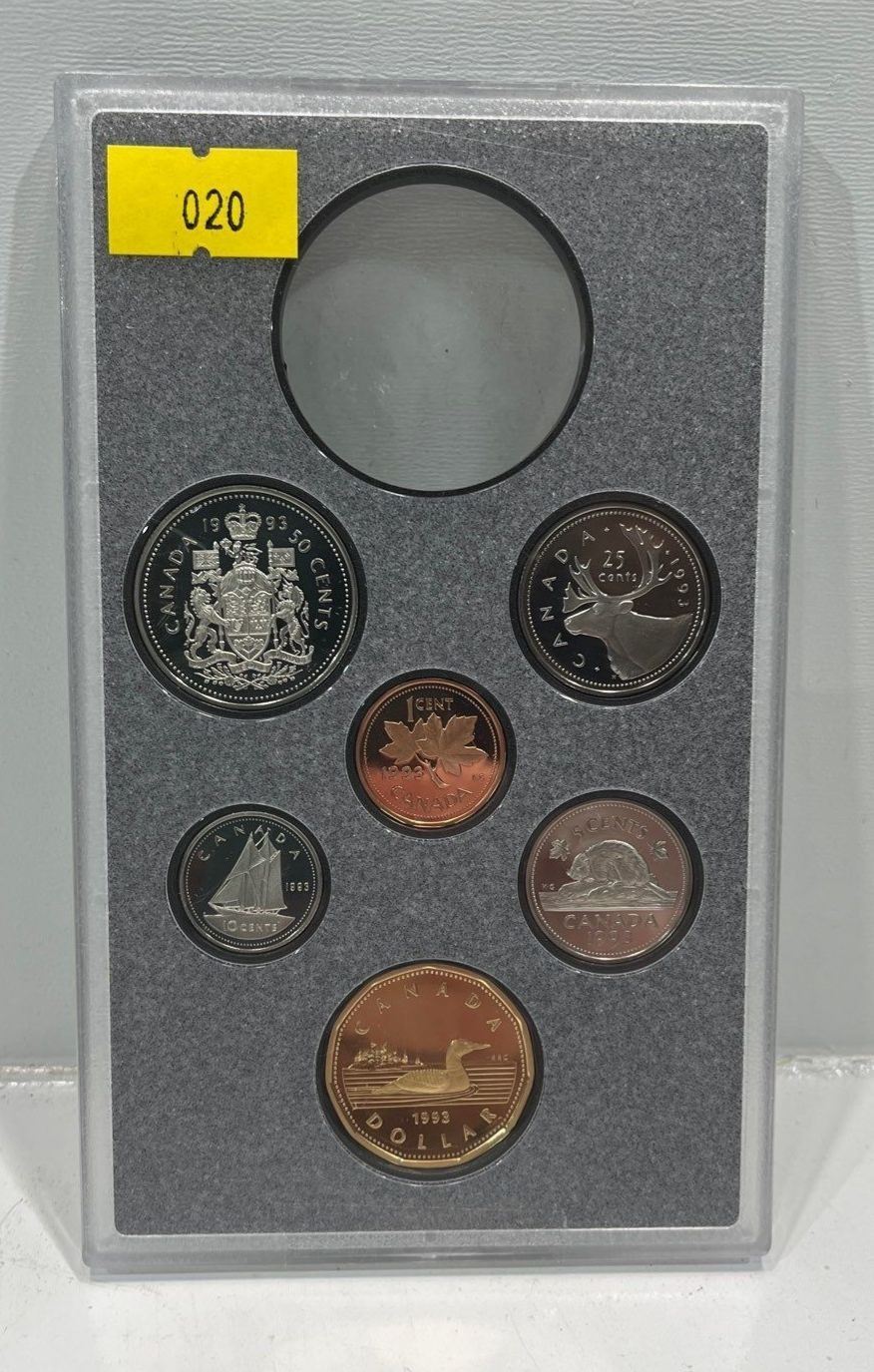 1993 Canada 6-coin Frosted Proof Set broken from the official Proof Double Dollar set issued by the RCM. You will receive the coins in the hard snap-lock case without the commemorative silver dollar (has been removed)