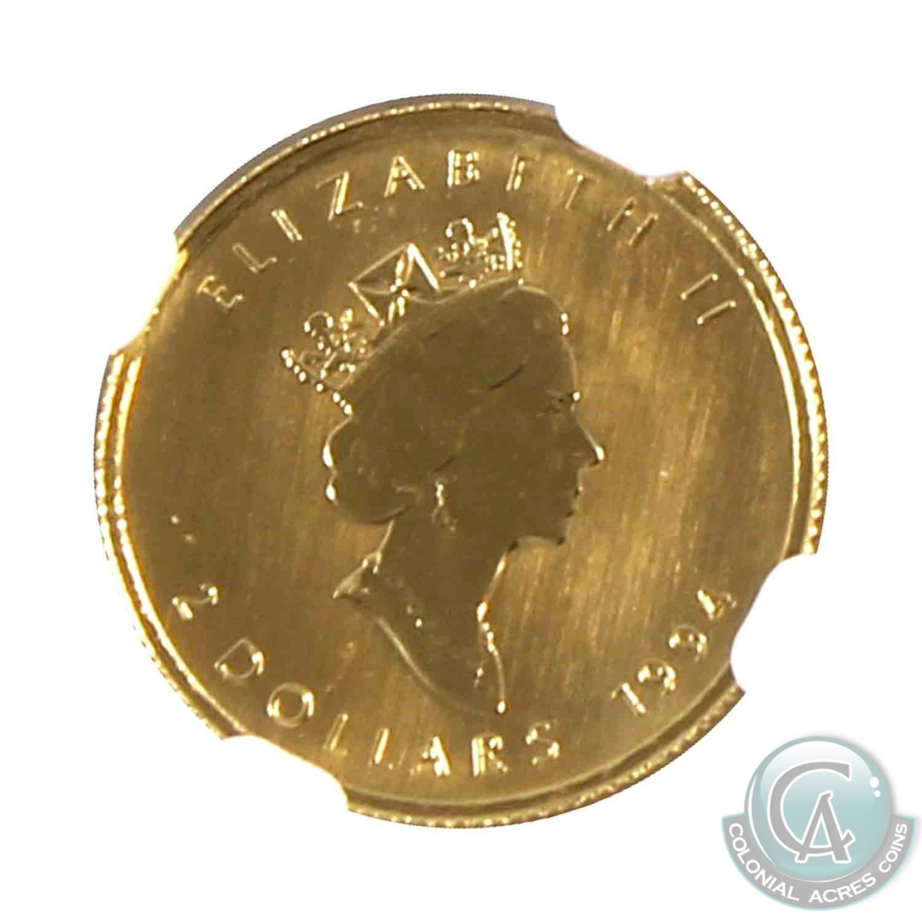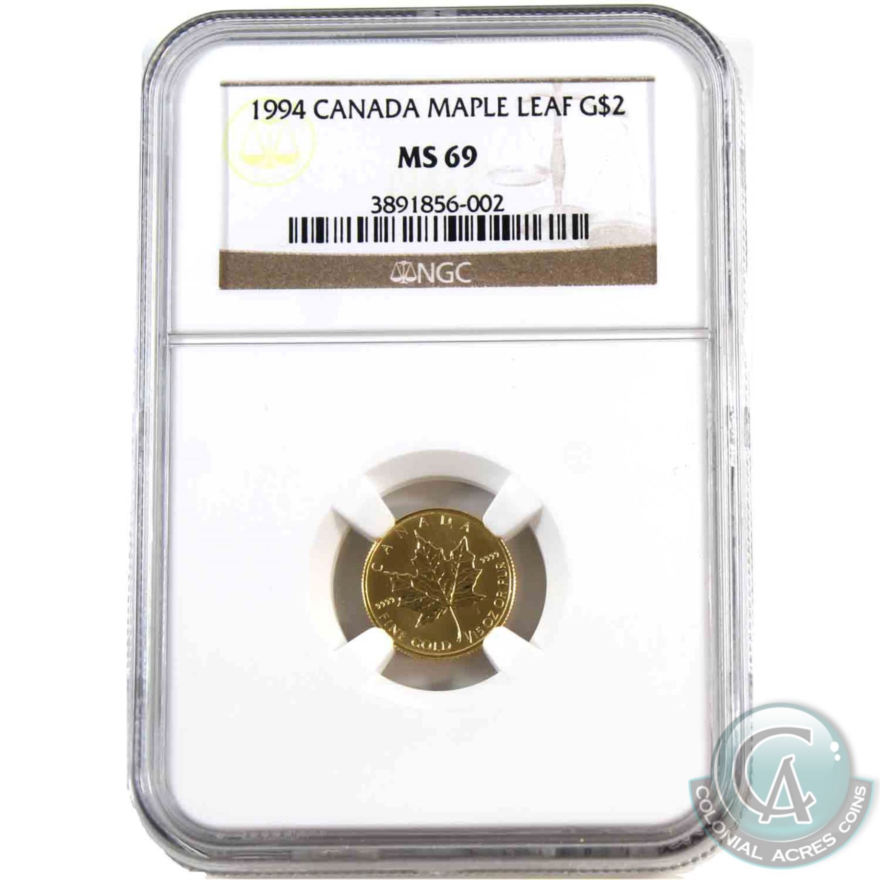 Canada 1994 1/15oz. $2 Gold Maple Leaf NGC Certified MS-69 (Tax Exempt). Produced only in 1994, the 1/15oz Gold Maples are extremely hard to find in today's market with a listed mintage of only 5,493.