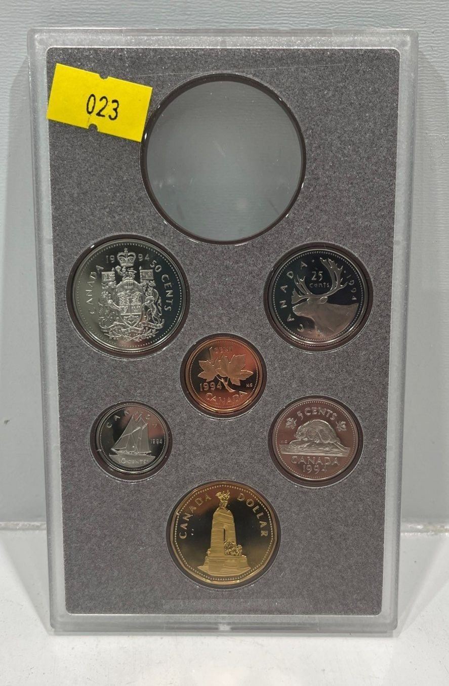 1994 Canada 6-coin Frosted Proof Set broken from the official Proof Double Dollar set issued by the RCM. You will receive the coins in the hard snap-lock case without the commemorative silver dollar (has been removed)