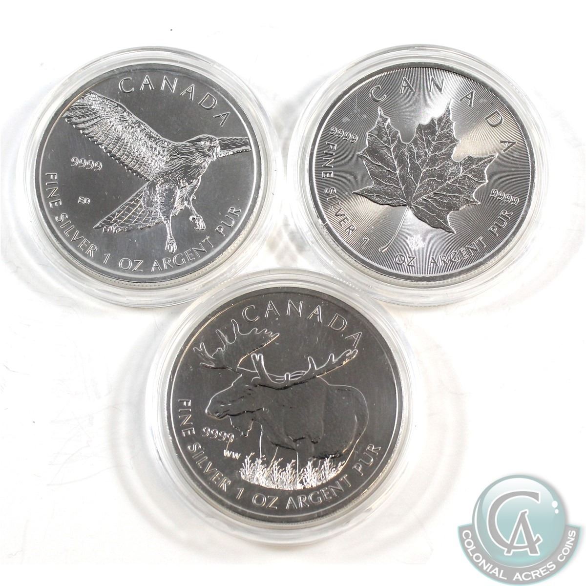 Canada 1oz Fine Silver Coin Collection (TAX Exempt). You will receive the 2012 Moose, 2015 Red-Tailed Hawk, and 2017 Silver Maple. Please note coins may contain toning/spots. 3pcs.