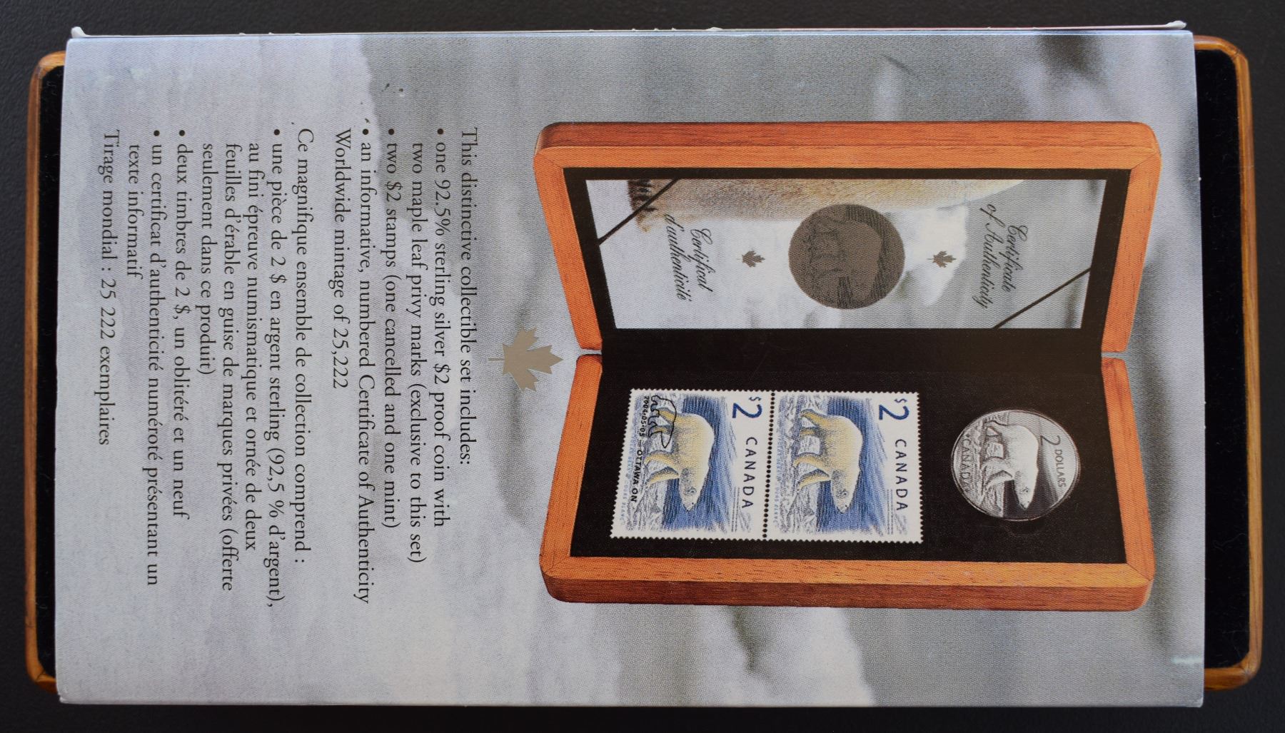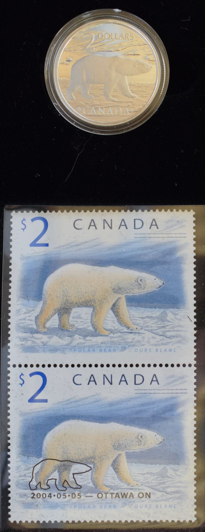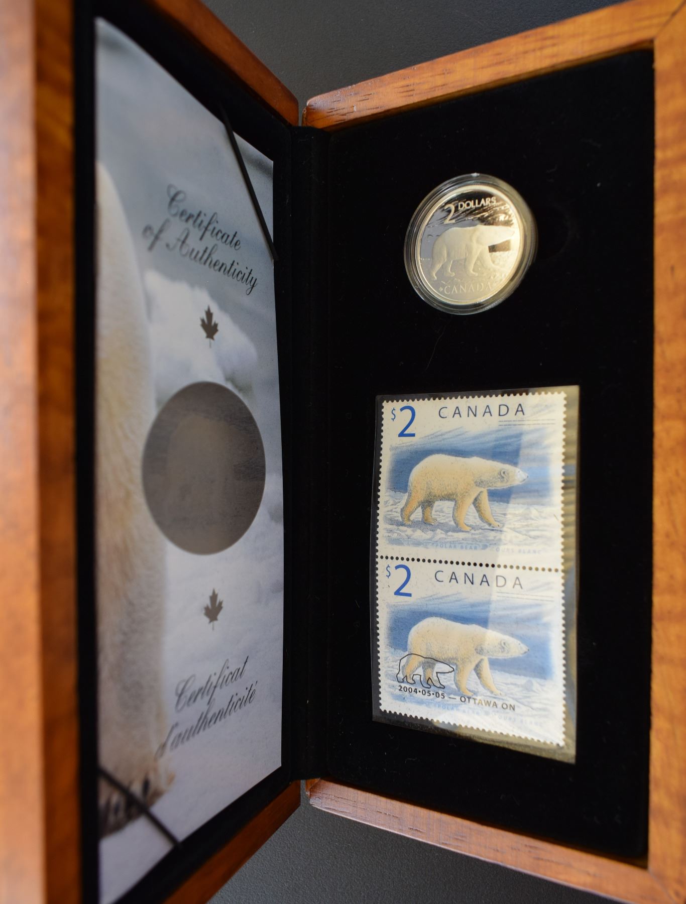 Canada, 2$ 2004 pair of 2$ Stamps and Proof 2$ .9999 Coin Set "The Proud Polar Bear" Limited Ed. in Wooden Box Original Presentation Impecable Scarse.