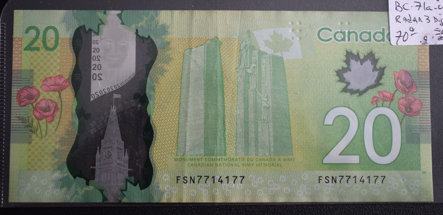 Canada, 20$ 2012 "3 Digits Radar" Serial # FSN7714177 VF++ BC-71a-I QEII